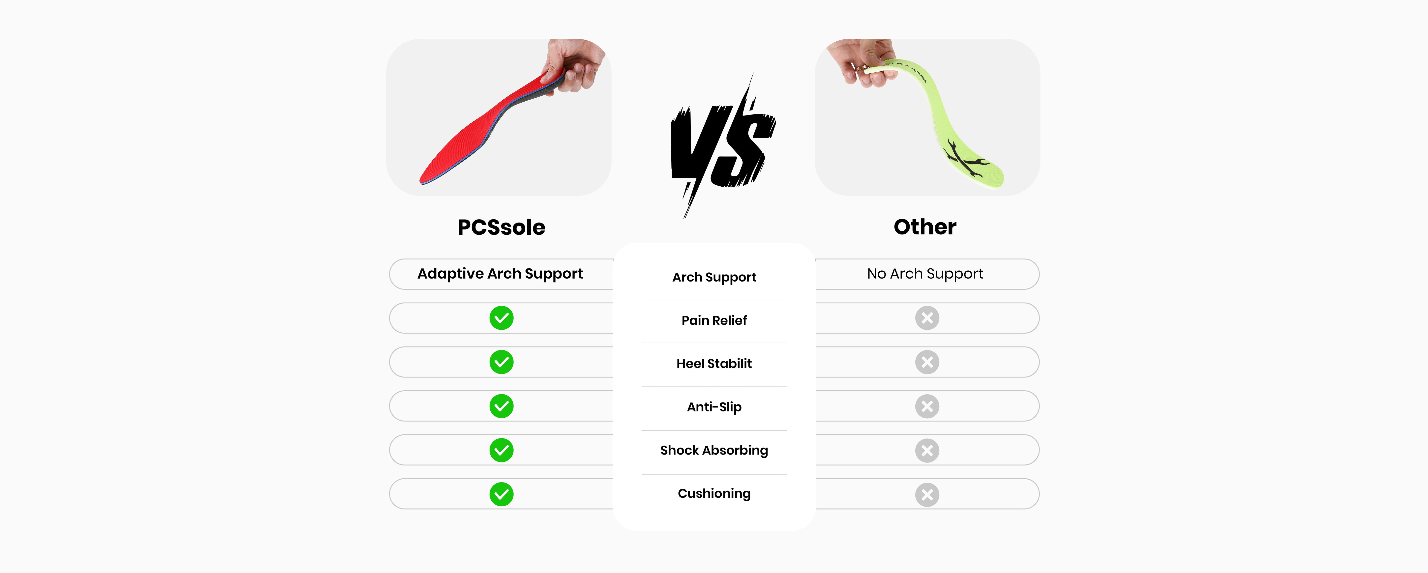 Fabricadas con fibra de carbono y materiales de primera calidad, además de una espuma firme y estabilizadora para una máxima absorción de impactos, puede sentir la libertad de tener pies sin dolor mientras está de pie, camina, corre o realiza cualquier otra actividad cotidiana gracias a las plantillas ortopédicas PCSsole Casual Pain Relief.