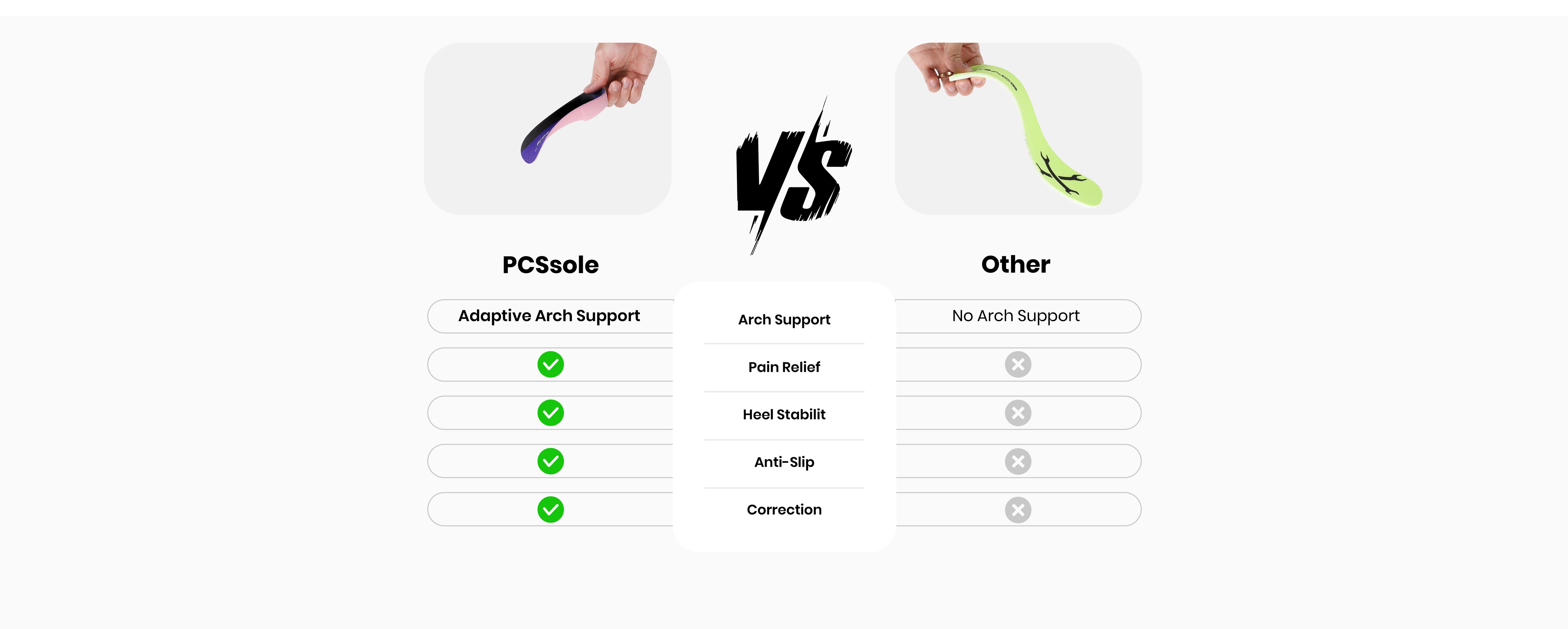 It all has to do with shape. While obvious when pointed out, most people probably forget that the bottom of their feet aren’t flat, but the inside of most shoes are. PCSsole insoles fill that gap, providing structured arch support, cradling comfort for your heel and foam cushioning for your whole foot.