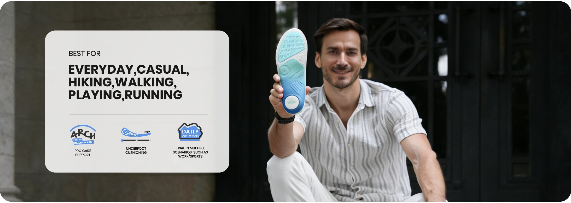 Everyone deserves proper foot support. The right insoles not only provide comfort but also support you through your day. Whether you're working, exercising, or relaxing, create a cozy haven for your feet and feel the care you deserve every step of the way. Because you’re worth it.