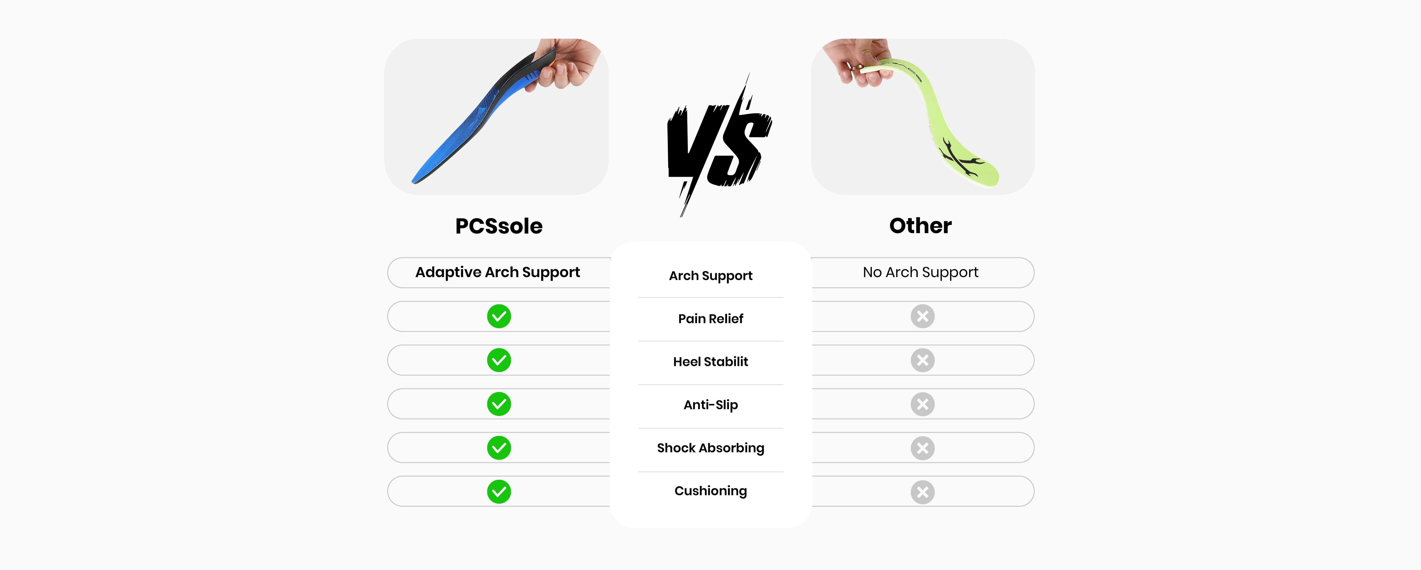 It all has to do with shape. While obvious when pointed out, most people probably forget that the bottom of their feet aren’t flat, but the inside of most shoes are. PCSsole insoles fill that gap, providing structured arch support, cradling comfort for your heel and foam cushioning for your whole foot.